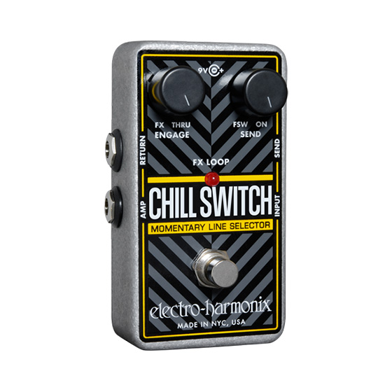 electro-harmonix-chillswitch The Chillswitch is an innovative line selector from Electro-Harmonix. This pedal can be used as a standard “kill” switch to mute your guitar’s signal or even be used to create a ‘stutter’ effect by rapidly muting/un-muting the signal. It can also be used in conjunction with a tap tempo delay to create a rhythmic pulse-like effect . Housed in EHX’s customary die-cast metal housing, the Chillswitch is a durable, versatile and compact workhorse.