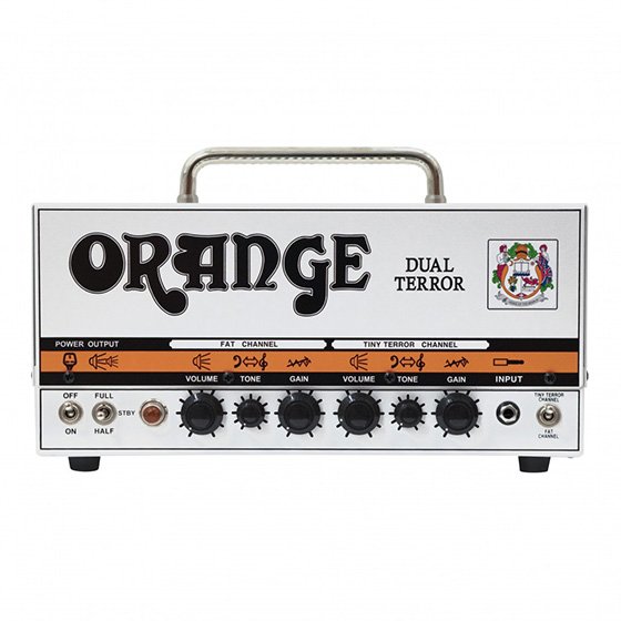 DUAL TERROR Diminutive size with tons of tone! The Dual Terror head from Orange puts up to 30 watts of British tube-amp awesomeness at your disposal - along with an amazing array of tonal versatility. The Dual Terror boasts a fat channel for warmer tones, while the Tiny Terror channel offers up Tiny Terror-style tones. Plenty powerful for small gigs, the Dual Terror also adapts well to studio and rehearsal use, as you can drop the wattage down to seven or 15 watts for low-volume saturation. Already a favorite with guitarists in many genres, the Dual Terror is a great head with tons of tone!